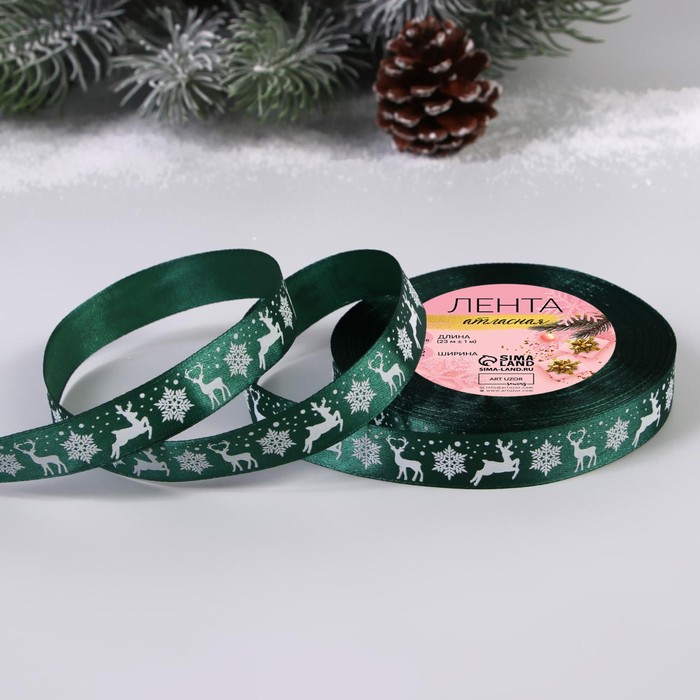 Лента атласная 1,2 см зеленая с оленями